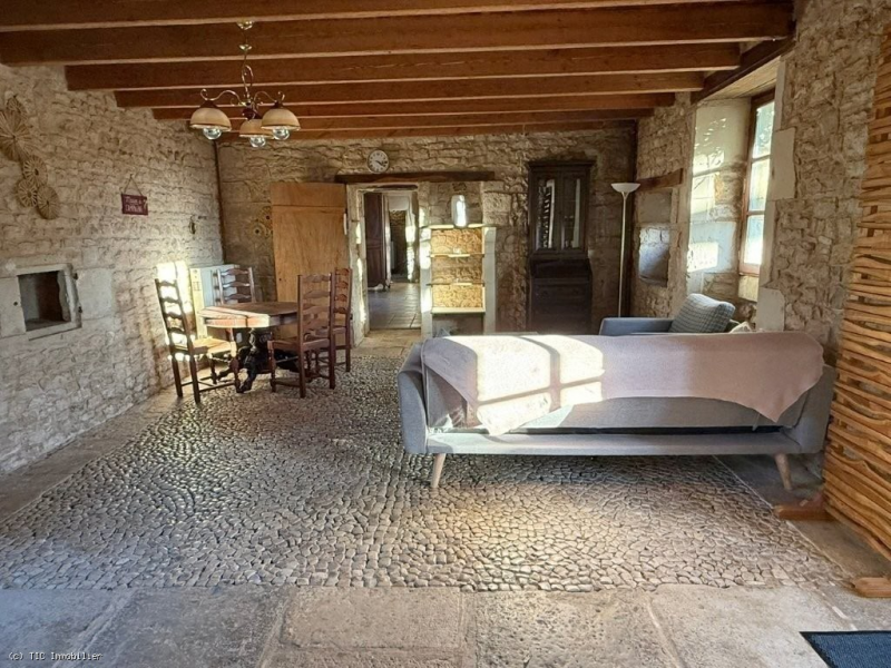 -Living room (30m2): cur de demoiselle stone floor, exposed stone walls, exposed beams