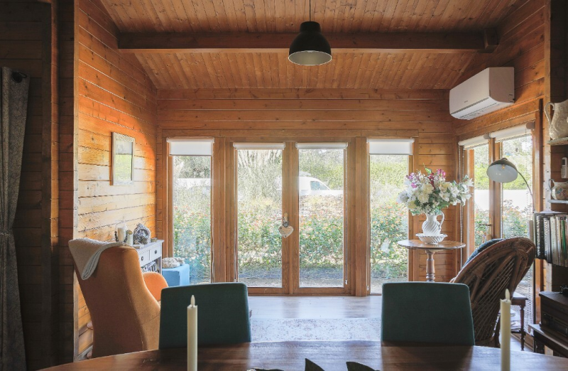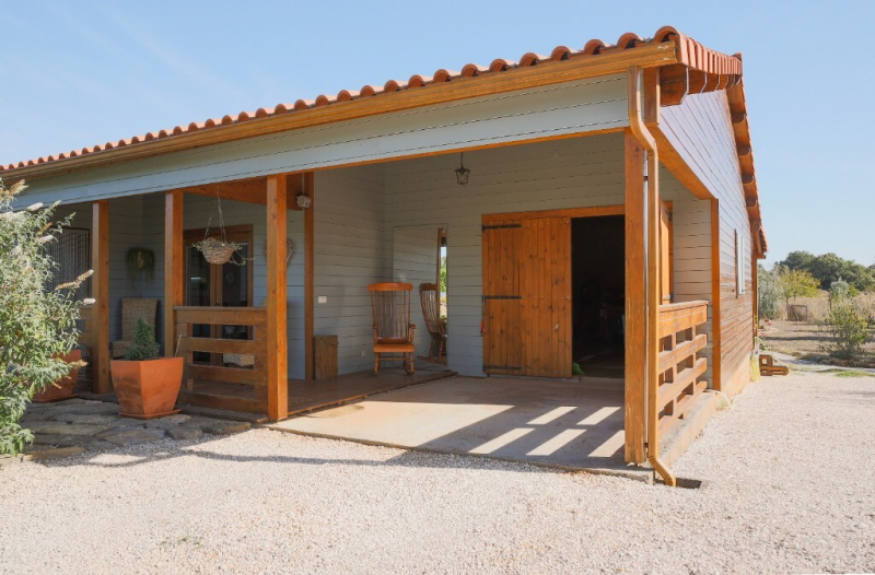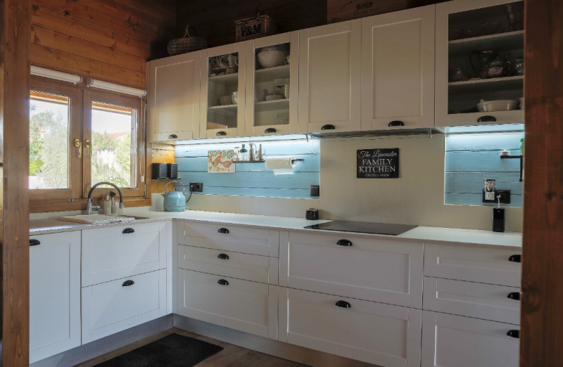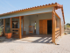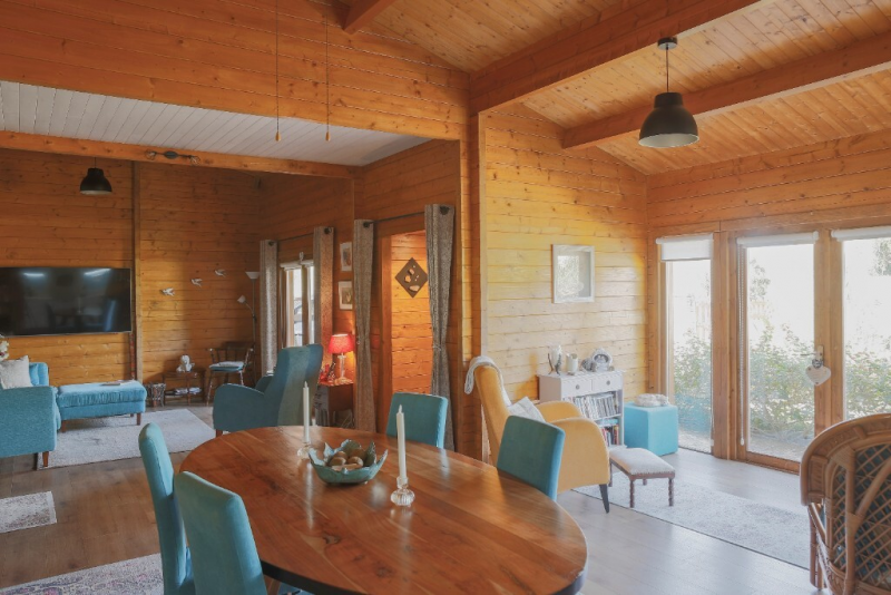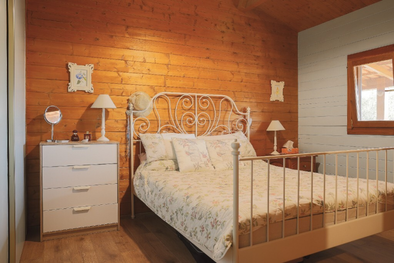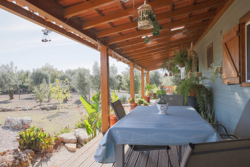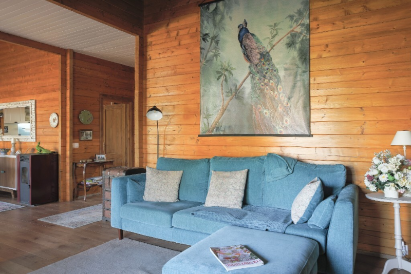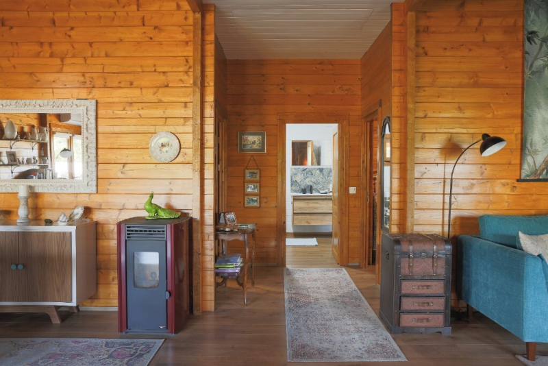 This three-bedroom villa features two with built-in wardrobes and a third bedroom with both interior and exterior access. It also features a bathroom, a spacious 40m² living and dining room with a pellet stove, and a renovated, contemporary, open-plan kitchen.