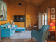 The front of the property features a garden with a small pond and parking for several vehicles.