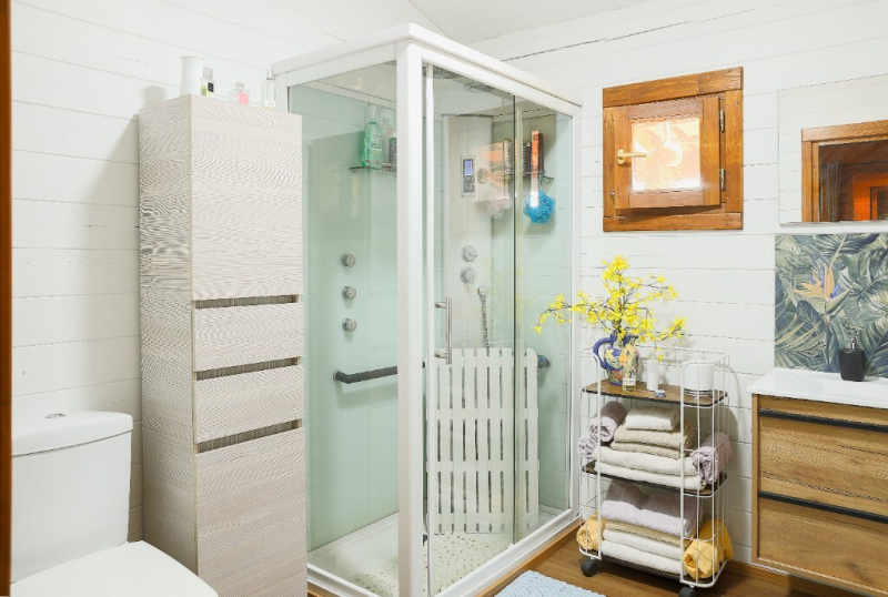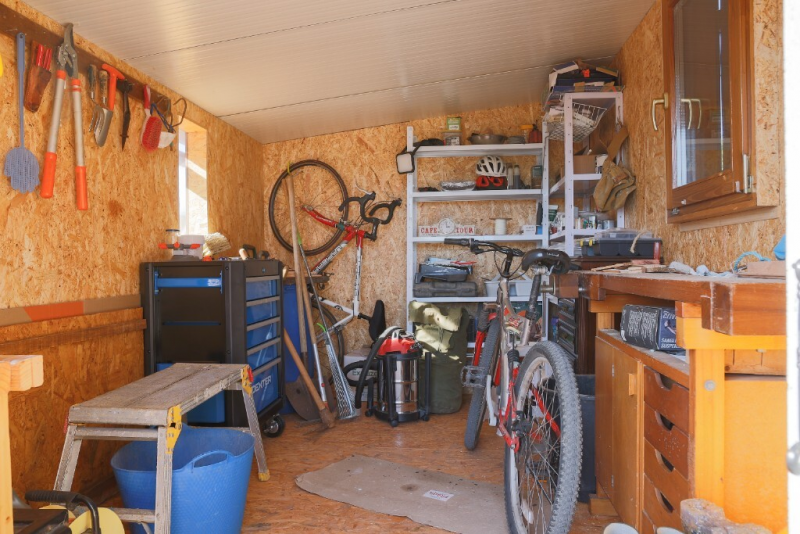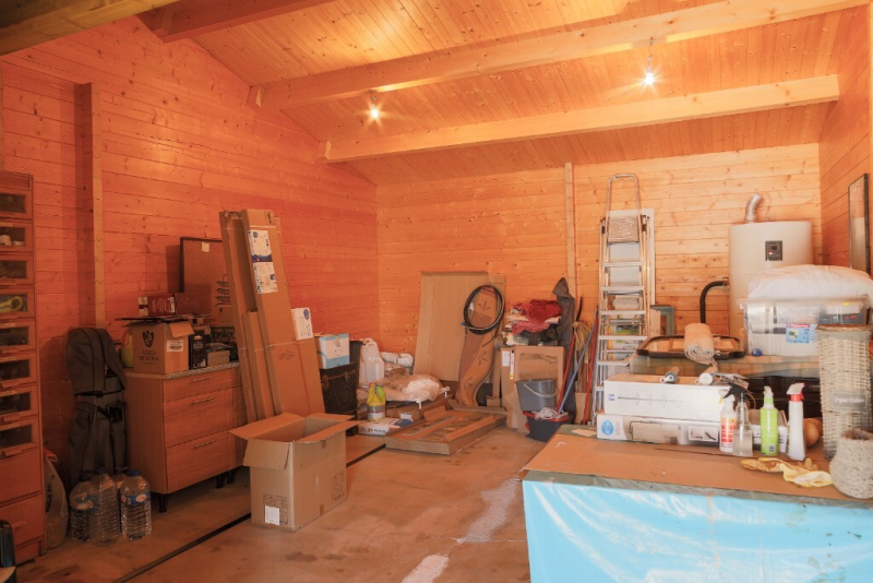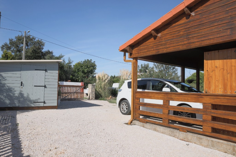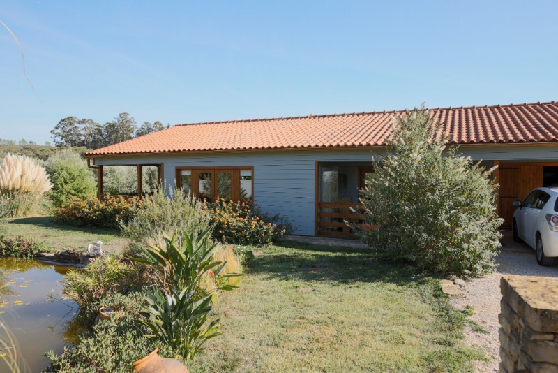 The villa is equipped with solar panels and also has a 30m² garage, which could be used as a studio or living room. The window beyond the entrance gate makes the space very bright and airy.