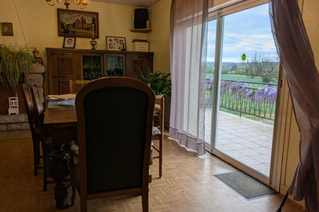 HOUSE FOR SALE: A stone's throw (by car) from JOSSELiN, from the N24 RENNES-LORiENT access, towards PONTiVY. Gently sloping access to the upper floor and living space on one level: bathroom: walk-in shower, two bedrooms, kitchen, dining room and living room with fireplace. Unobstructed view. Heat pump, mains drainage. Land currently being demarcated (approx. 2600 m2). Not overlooked. (4.51 % fees incl. VAT at the buyer's expense.)