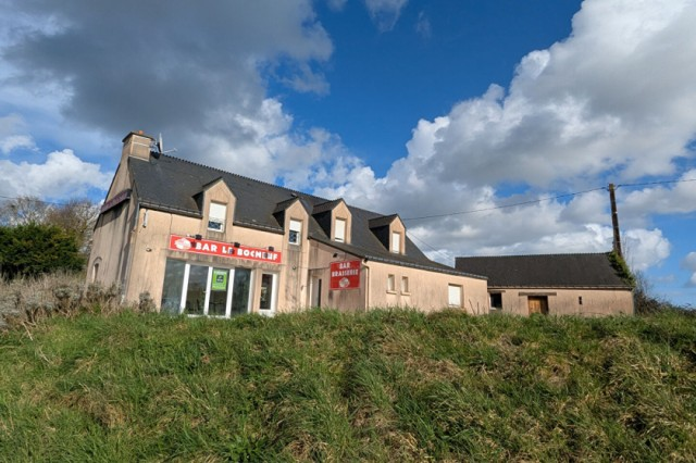 Vacant building with former commercial premises (bar), ideal for a large residence or mixed use (License iV available for purchase separately). Bar area, large unfurnished kitchen, additional room, and toilet. Terrace. Upstairs: large landing, 3 good-sized bedrooms, spacious bathroom, and WC. Outbuilding: Garage/storage room with service door, window, and electricity, on a concrete floor. Space to park several vehicles on the street side. Views of the Canal and its towpath from the terrace and garden. A beautiful property 7 minutes from Josselin and 20 minutes from Pontivy! Suitable for residential or business venture. (5.50 % fees incl. VAT at the buyer's expense.)