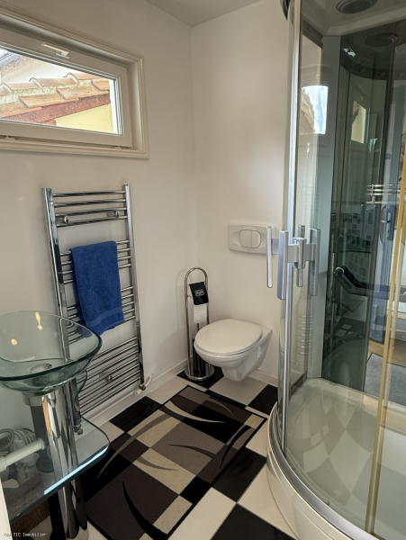 Laundry Room 10m2 Tiled floor, fitted units (simple to convert to a kitchen for this wing) Upstairs (accessed from laundry room):Sitting Room 23m2 Parquet floor, beams, viewsBedroom 12m2 Parquet floorBedroom 13m2 Parquet floor, low door to decking area giving access to the courtyard tooBathroom 6m2 Parquet floor, double-ended "Villeroy andamp; Boch" bath, WC, hand basin, heated towel rail and velux