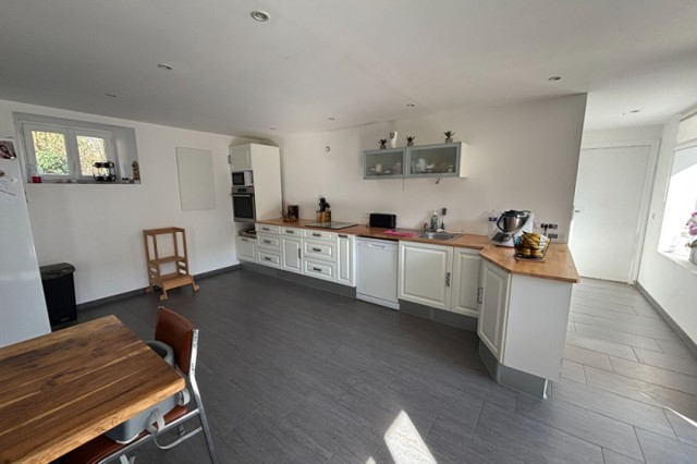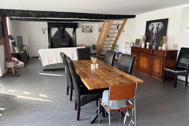 On the ground floor, you will discover a large, bright living room with an open-plan fitted and equipped kitchen, complete with a fireplace and wood-burning stove, as well as a master bedroom with a private shower room, a separate WC and a laundry room.
