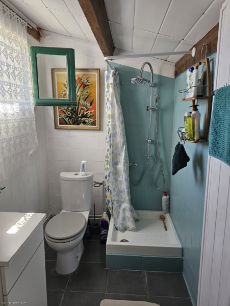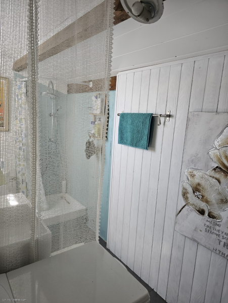 -Shower room (4.85m2): tiled floor, shower, toilet, washbasin, washing machine, small window
