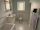 -Bathroom 7 m2: laminate flooring, bath with shower, toilet, washbasin