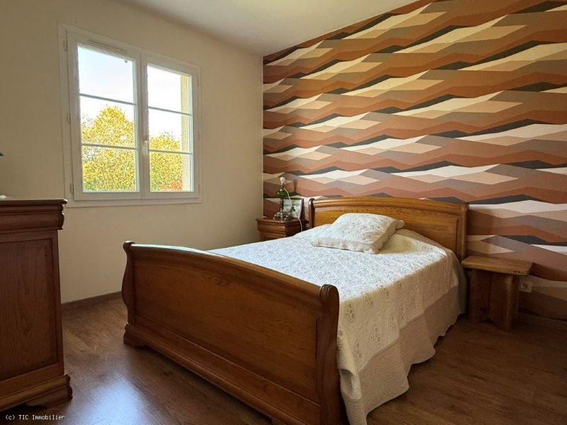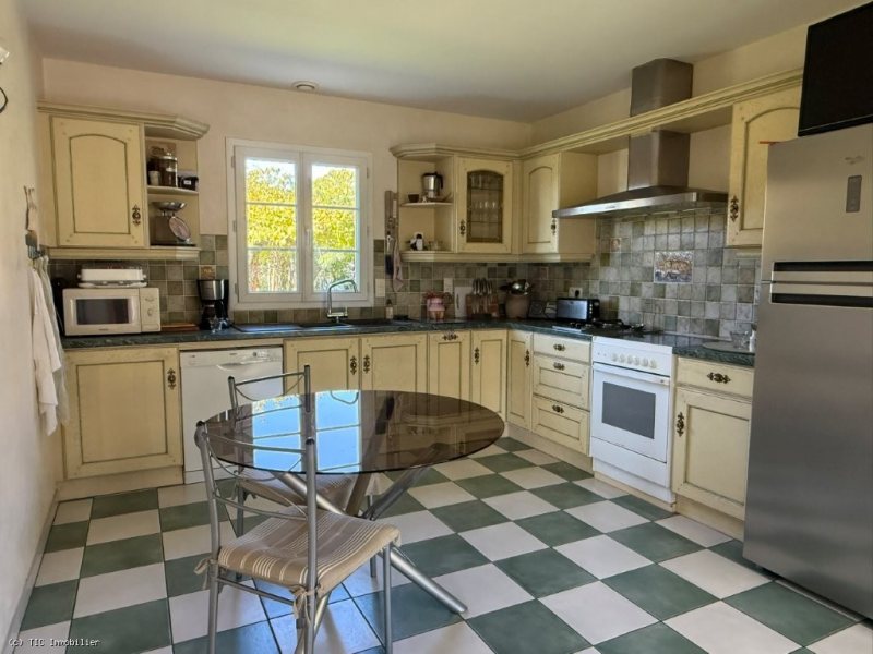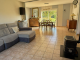-Living room (34m2): tiled floor, wood stove, 2 French windows