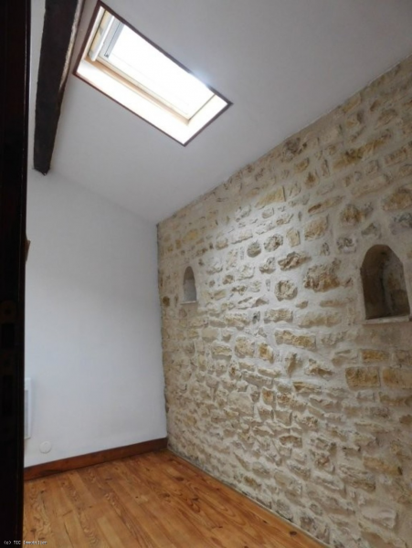 Small Bedroom 2 7 m2: wooden floor, exposed stone walls, Velux window.