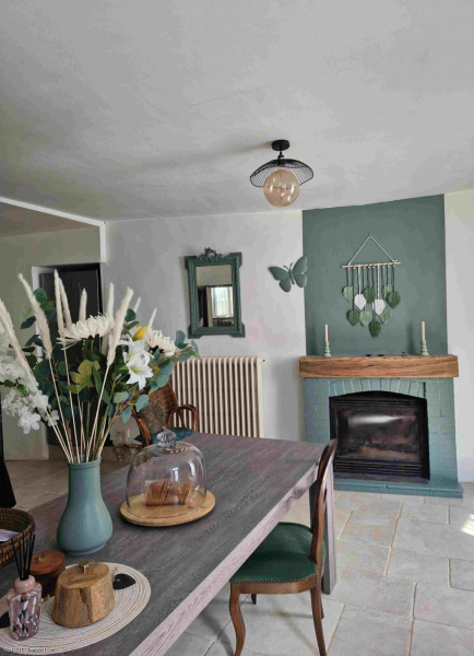 -Fitted kitchen / dining room (36m2): tiled floor, wood burner