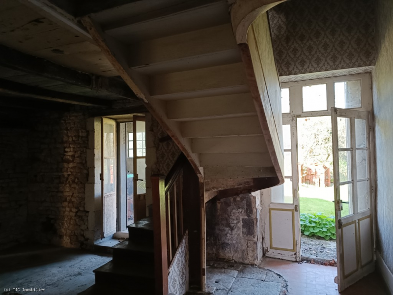 -Hall (19m2): tiled and stone flooring, beautiful wooden staircase in good condition, two single-glazed French windows