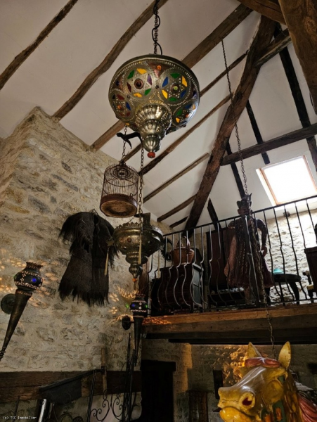 -Living room (42m2): wooden floor, wood burning stove, exposed stone, beams