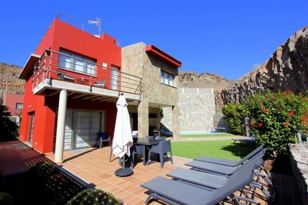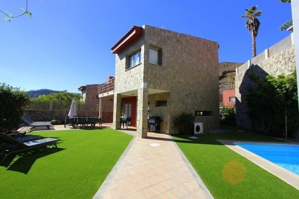 4 bedroom villa in Tauro, Mogán. ~ ~ Independent house with private pool and garage located in the southeast of Gran Canaria in the village of Tauro near the Anfi Tauro Golf Course and the beaches of Amadores and Tauro. Area recognized as the best climate in the world.~ ~ Distributed over three floors it has four bedrooms, two bathrooms, balcony and terrace on the top floor. Equipped with air conditioning in bedrooms and living room. ~ It has a garage, heated pool and large solarium. ~ ~ Located just a few minutes from Mogán Mall in Puerto Rico with a wide range of restaurants and shops. And 30 minutes by car from the airport.