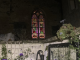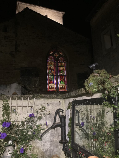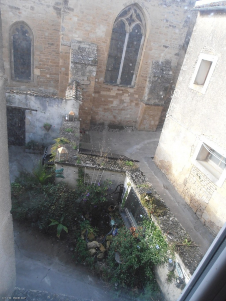 Enclosed, sheltered courtyard with a pond with a fountain, storage shed, and a rear door giving access on foot into the village.