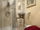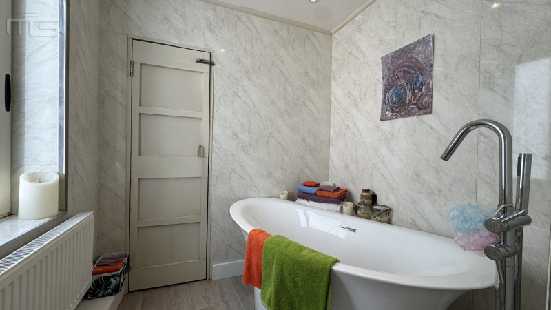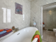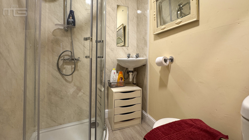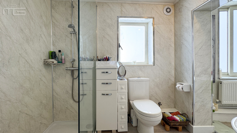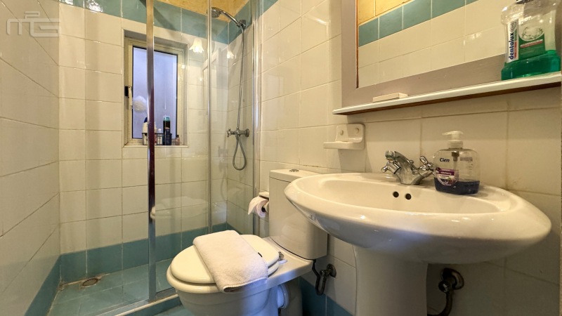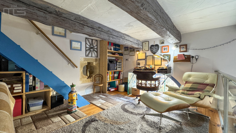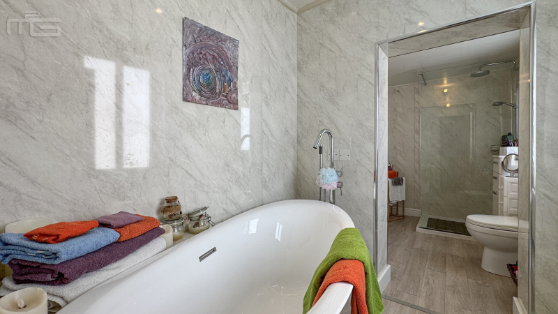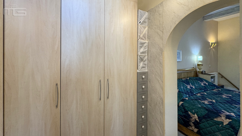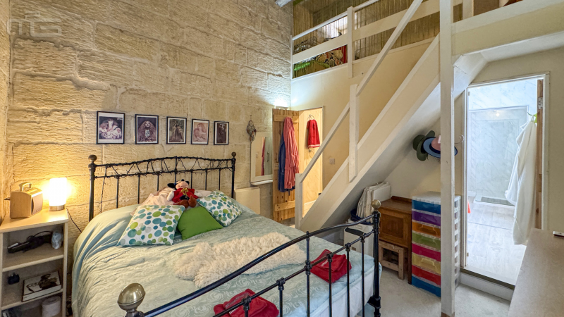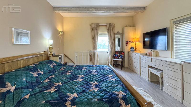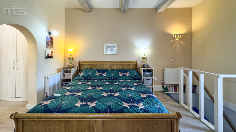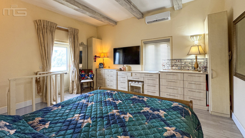 A wide traditional stone staircase from the front hallway takes you up to a mezzanine workshop/storage area and the three bedrooms with roof terrace. The spacious first-floor landing includes ample built-in storage. The first double bedroom is generous in size and complete with an ensuite shower room. The second double bedroom connects to two bathrooms — one ensuite, and another shared with the master suite. This shared bathroom is beautifully designed, featuring both a bathtub and a large shower.
