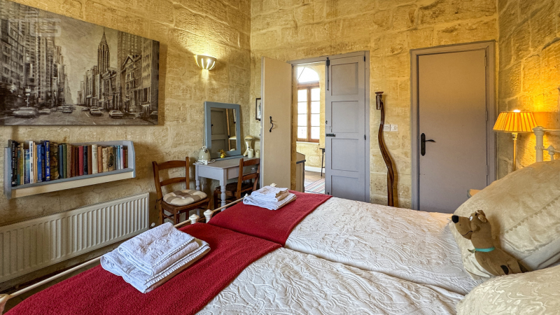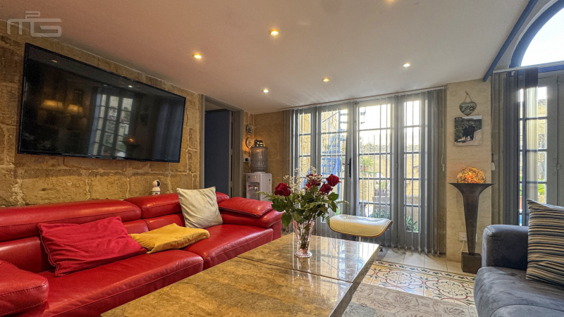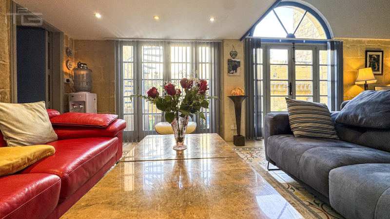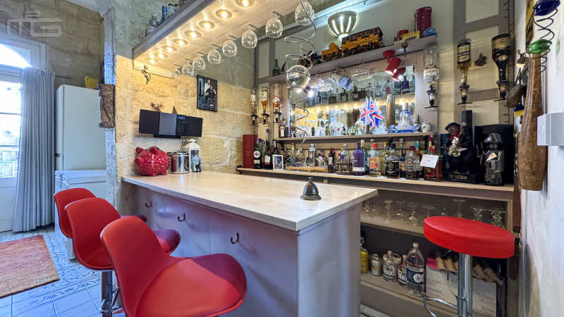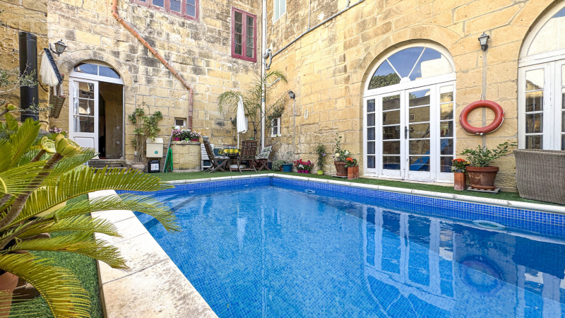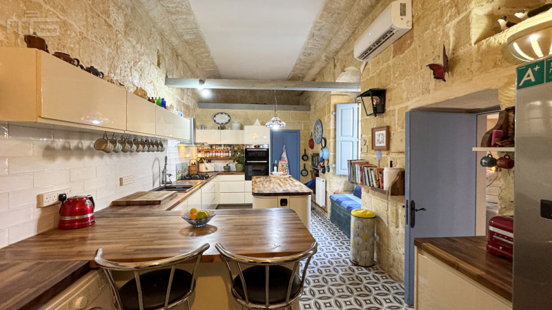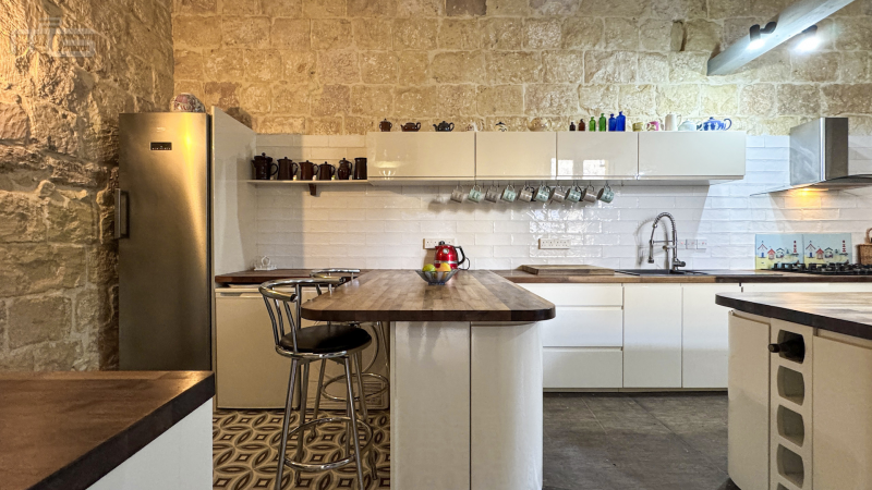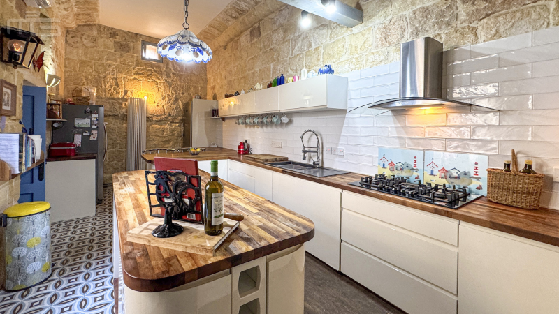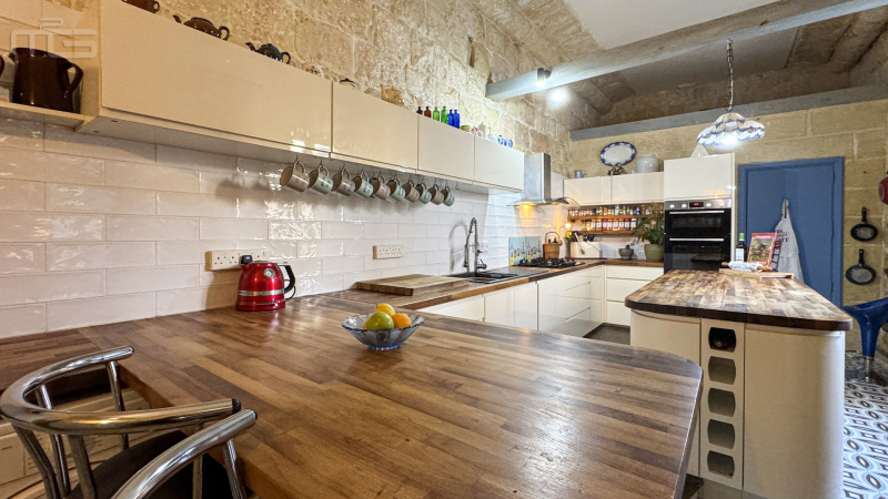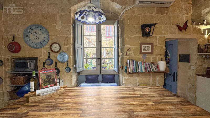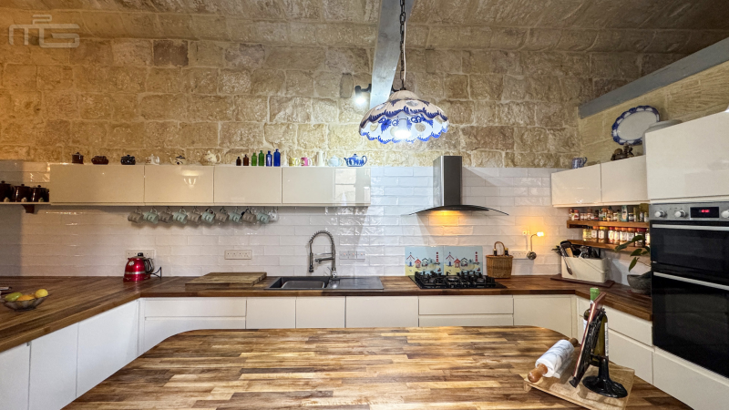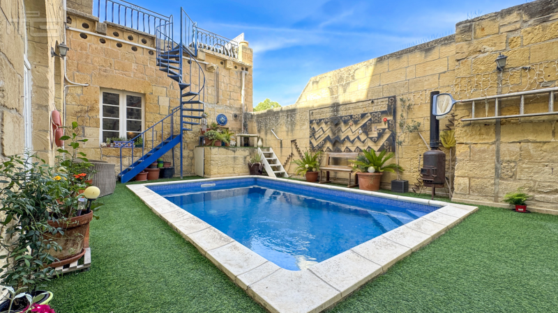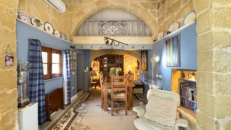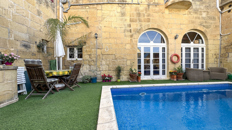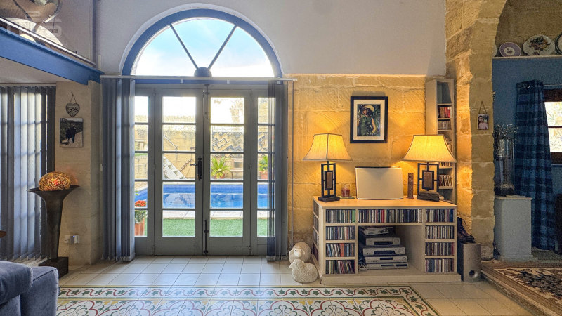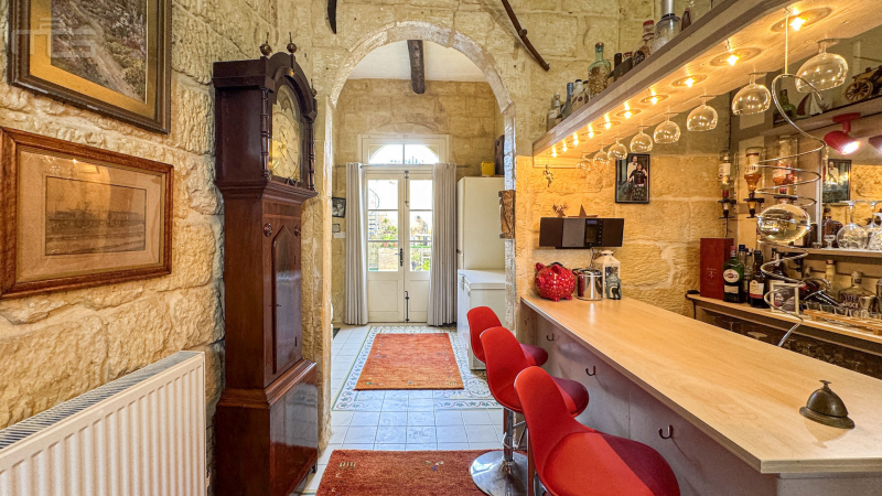 This beautifully finished traditional farmhouse, located on the outskirts of Victoria and close to Munxar, welcomes you through a spacious hallway with an adjacent storage room. From here, you step into a fully equipped bar area with a family cloakroom nearby and direct access to the central courtyard and swimming pool.