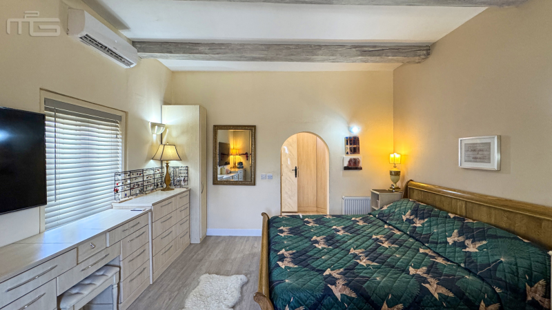 From the living room, you move into a very spacious kitchen and informal dining area, centred around a large island and separate breakfast bar, with abundant storage. This room boasts original stone “xorok” and “kileb” ceilings, a reminder of the property’s 200-plus years of history. Off the end of the kitchen, you’ll also find a practical utility room with toilet facilities.
