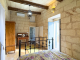 To the left is a cosy, arched combined kitchen and dining room which creates the feeling of cottage living. A charming room to dine in, with hand cut stone walls, original stone shelves, and traditional patterned cement tile floor, and with windows opening onto the totally private and sheltered courtyard.