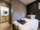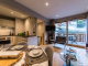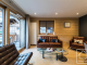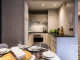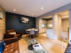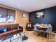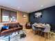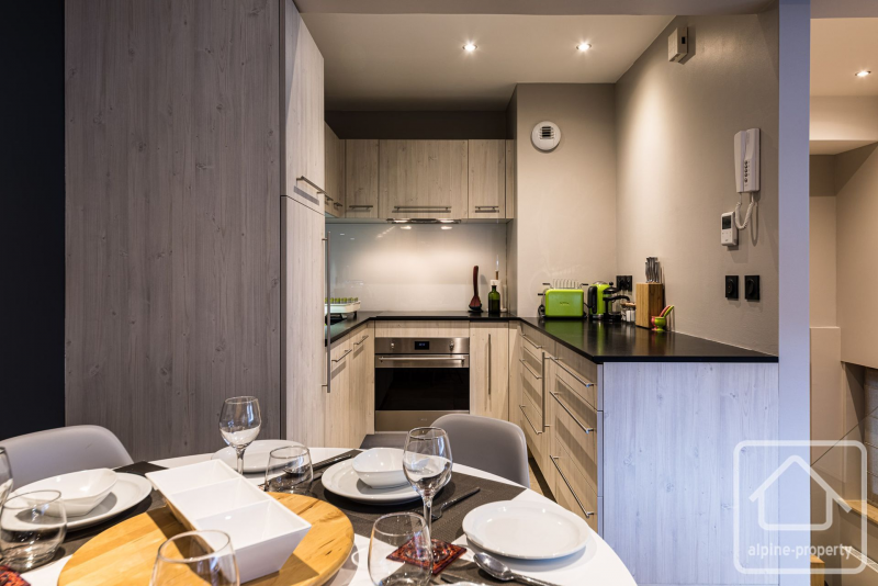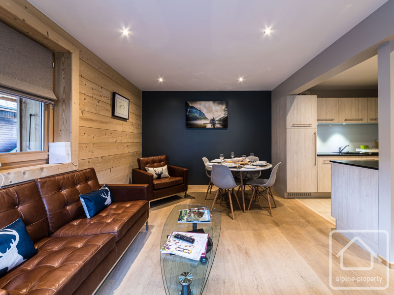 The apartment has its own private entrance from the main residence, leading to a central stairwell connecting the living space above and the bedrooms below. **Upstairs**, you’ll find a bright and cosy open-plan kitchen, living and dining area, opening onto a south-facing balcony. The sitting room is tastefully furnished with a comfortable leather sofa and armchairs, a six-seater dining table and a large flat-scireen TV, creating a welcoming space to relax after a day in the mountains. The modern kitchen is fully equipped with granite worktops and splashbacks, integral appliances and all necessary crockery and utensils.