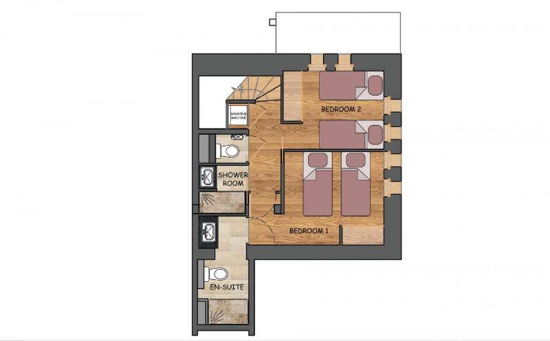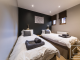 **On the lower level** are two flexible twin/double bedrooms with zip-and-link beds and built-in wardrobes. The principal bedroom benefits from a spacious en-suite shower room, while the second bedroom is served by an additional shower room and a separate WC. A practical laundry area, along with closed storage cupboards under the stairs, adds further convenience.