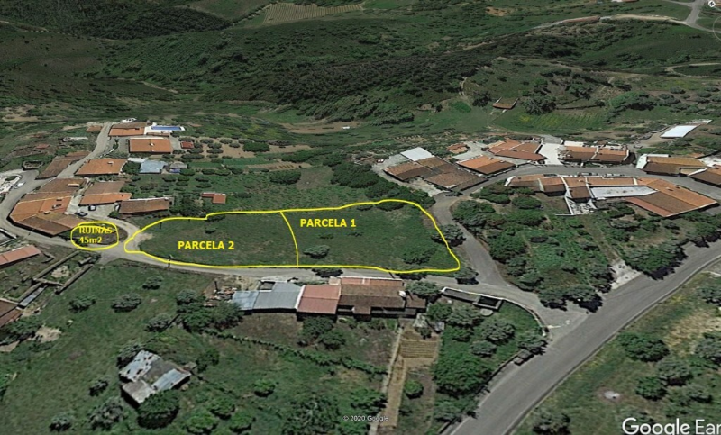 The land has a total area of 2080 m², with two frontages onto the road. The property consists of two plots, one urban with 1040 m², which includes a well, and another rural plot of 1040 m², located in an urban area.