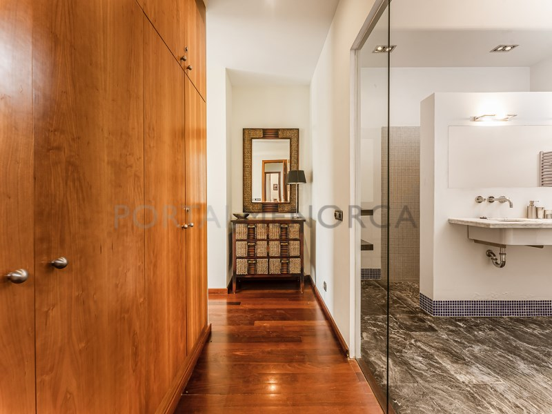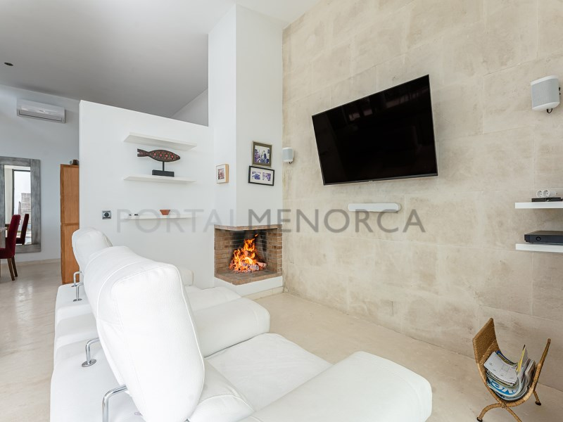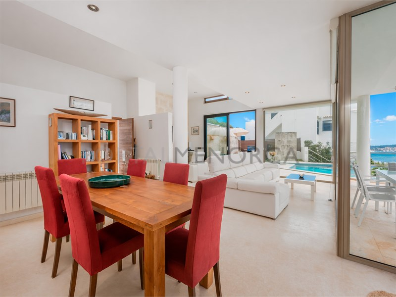 The villa welcomes you through a stylish entrance hall that opens into a light-filled open-plan living space designed to maximize both comfort and the spectacular sea views. Large windows and sliding doors connect the interior seamlessly with fabulous terraces, creating the perfect setting for both relaxed everyday living and elegant entertaining while overlooking the iconic Port of Mahón.