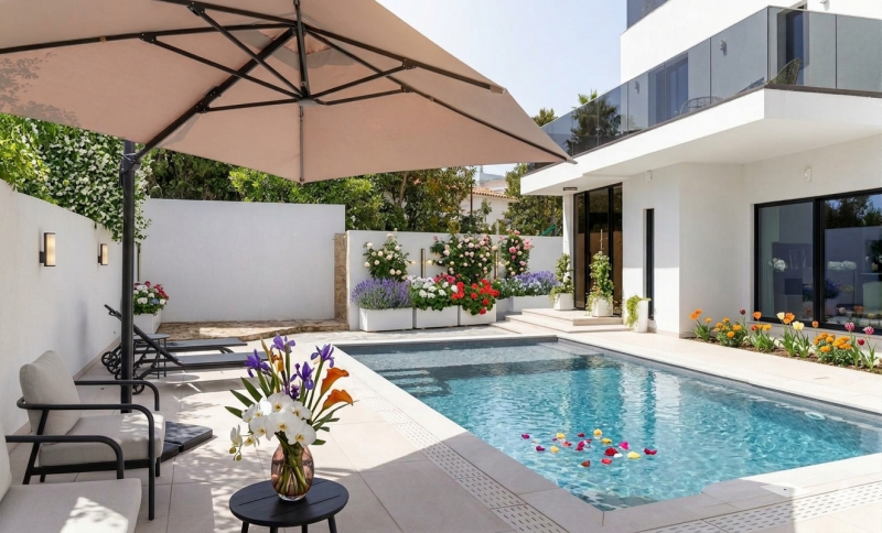 Piscina Infinity-Style: Un oasis exterior con sistema de cloración salina, diseñado para fundirse con el horizonte.