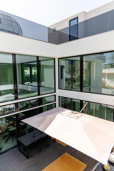 La villa destaca por su impresionante volumetría cúbica y su fachada blanca radiante, que contrasta con la sofisticación técnica de sus cerramientos de cristal de seguridad ahumado. En el interior, el bienestar es absoluto gracias a un sistema de calefacción por suelo radiante en toda la casa, complementado con aire acondicionado integral, garantizando un clima perfecto en cualquier estación del año.