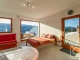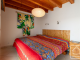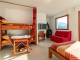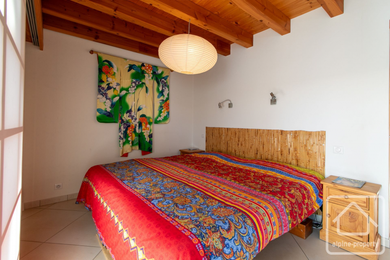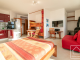 On the same level, with its own private entrance, is an independent studio. The studio comprises a shower room with separate WC, a living space with a double bed and bunk beds, a kitchenette, a lounge area with a wood-burning stove, a dining area, and access to a private terrace.