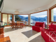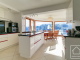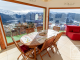 **The upper level** is dedicated to a spacious duplex apartment. It comprises an entrance hall leading to an open-plan kitchen, dining area, and living room centred around a suspended fireplace, with direct access to a large terrace and balcony that fully embrace the views. This level also includes a double bedroom, a bathroom with both shower and bath, a separate WC, and a dedicated office space. A former garage has been converted into a practical storage and laundry area. Also on this level are a double garage with a storage mezzanine and two covered exterior parking spaces.