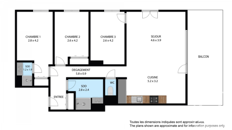 Apartment C104 is a spacious T4 of 86.2 sqm located on the 1st floor. It consists of an entrance with a cupboard and a corridor leading to a bedroom with a shower room, two other bedrooms, a bathroom, a separate toilet, and a generous living room of 33 sqm with an equipped kitchen. The 15 sqm balcony facing South offers a view of Les Aravis.