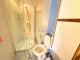 Layout: Living room with kitchen and dining area, bedroom, bathroom with shower, balcony with mountain view