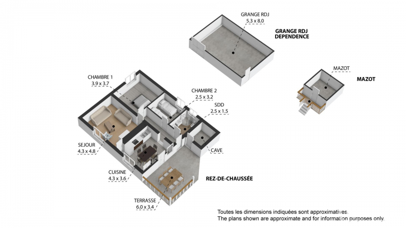 This former farmstead spans two levels plus a basement, with a footprint of around 100m², and includes: