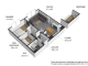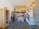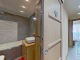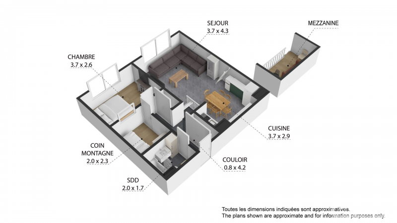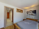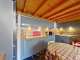It comprises an entrance hall with two large wardrobes and hanging space. This leads to a bathroom with WC, a cabin bedroom with bunk beds, and a bedroom featuring a large bay window that enjoys the morning light. A few steps lead up to the living area, where the generous ceiling height has allowed for the creation of a cosy mezzanine above the modern, fully equipped kitchen.