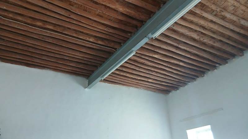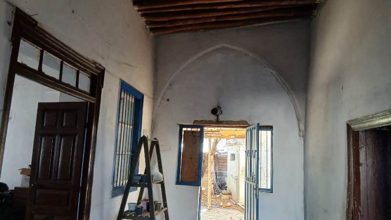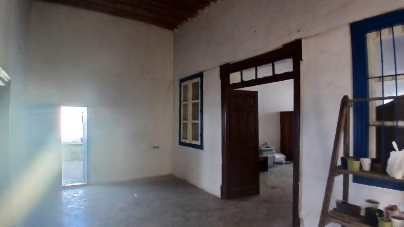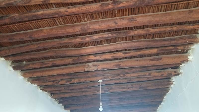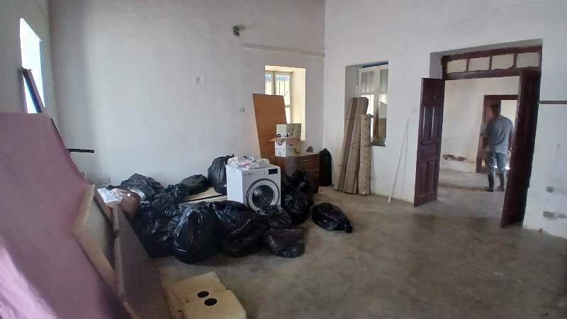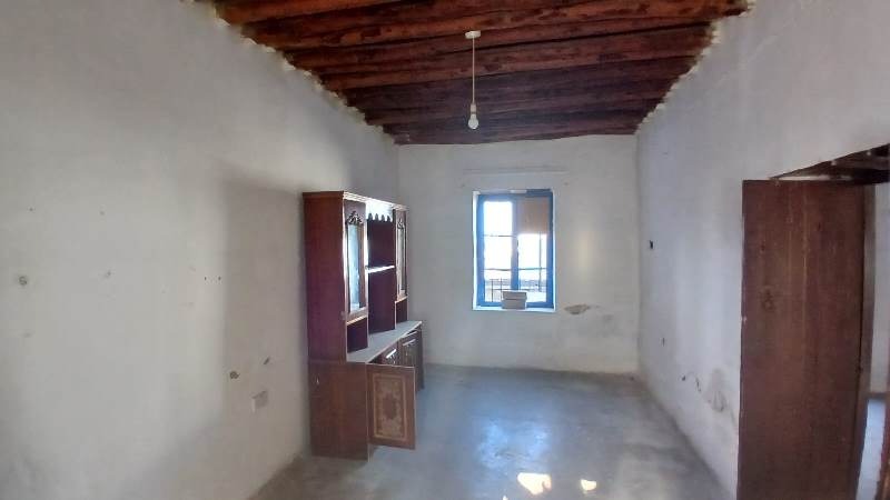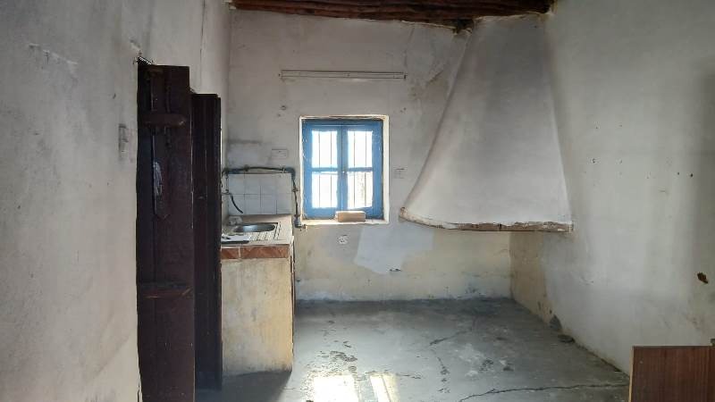 Upon entering the property, you are welcomed by an open and airy feel, created by traditional high ceilings, exposed wooden beams, and attractive archways that highlight the home’s authentic character. To the left is the original kitchen, featuring a small sink, cabinetry, and a traditional large fireplace. To the right of the main living area is an additional generously sized room, offering flexibility for living or sleeping accommodation.
