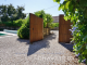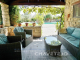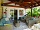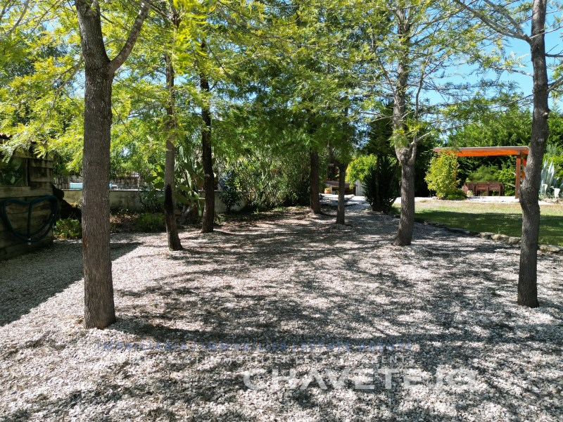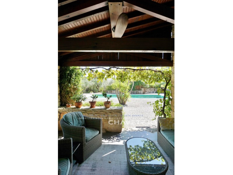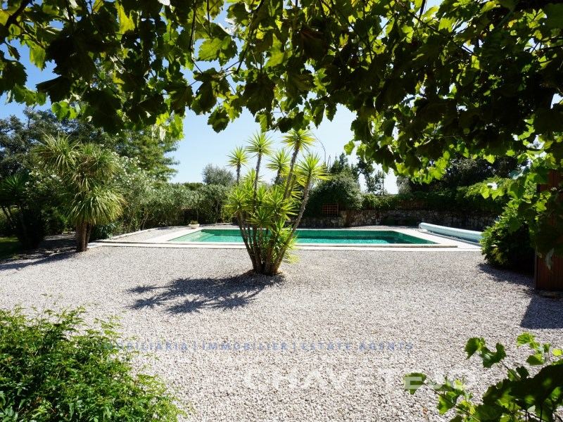 The flat, walled garden is truly beautiful and mature, thoughtfully landscaped with lawns, paved paths, and olive trees. A 10m x 5m swimming pool with surrounding patio and an automatic irrigation system make the outdoor areas ideal for relaxing or entertaining. An adjacent paved terrace, featuring palms and a charming wooden pergola, further enhances the Mediterranean ambiance.