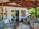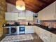 The kitchen, accessed through a stone archway, exudes charming cottage character, with white cabinetry, granite worktops, a oven and hob, and a washing machine. Plenty of storage ensures both practicality and style, making it a welcoming space for everyday cooking or relaxed family meals. Patio doors open onto a covered terrace with a tiled floor and wooden roof beams the perfect space for breakfast in the sunshine or evening meals under the stars.