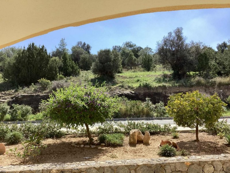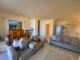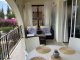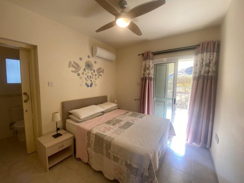 The spacious lounge easily accommodates comfortable sofas, a TV unit, and a six-seater dining table. From here, glass French sliding doors open onto a sea-facing terrace, offering stunning views of the Mediterranean Sea and the beautifully landscaped gardens—enjoyable from both inside and out.
