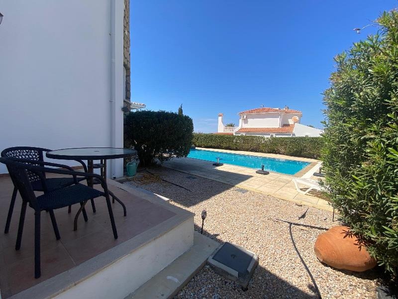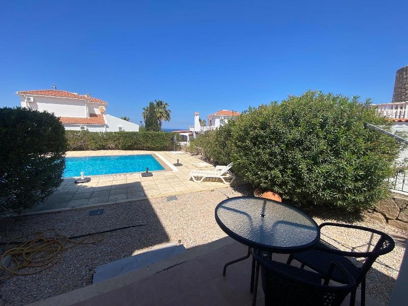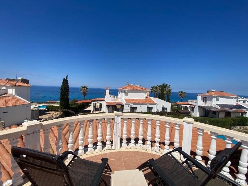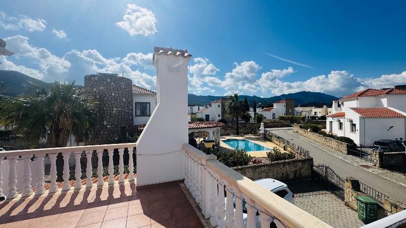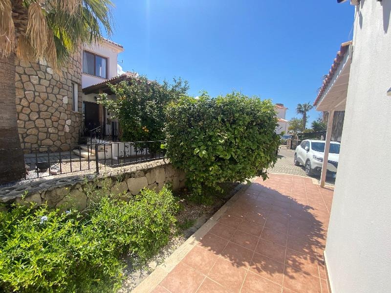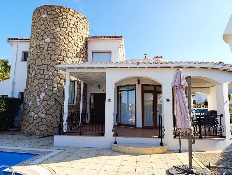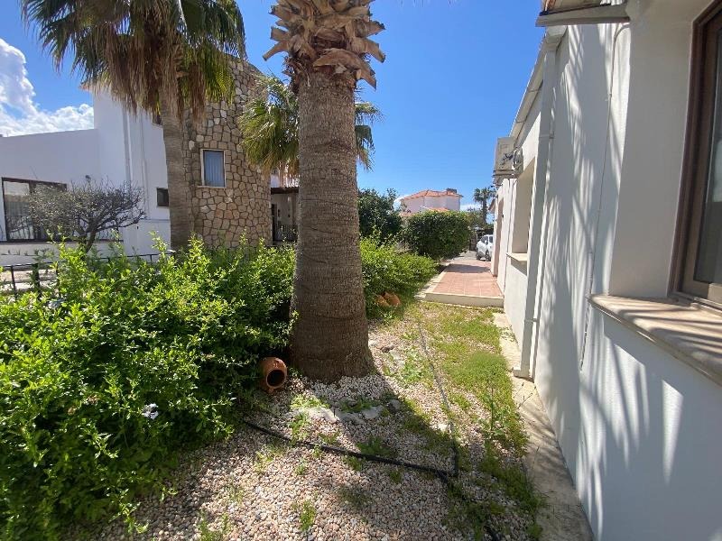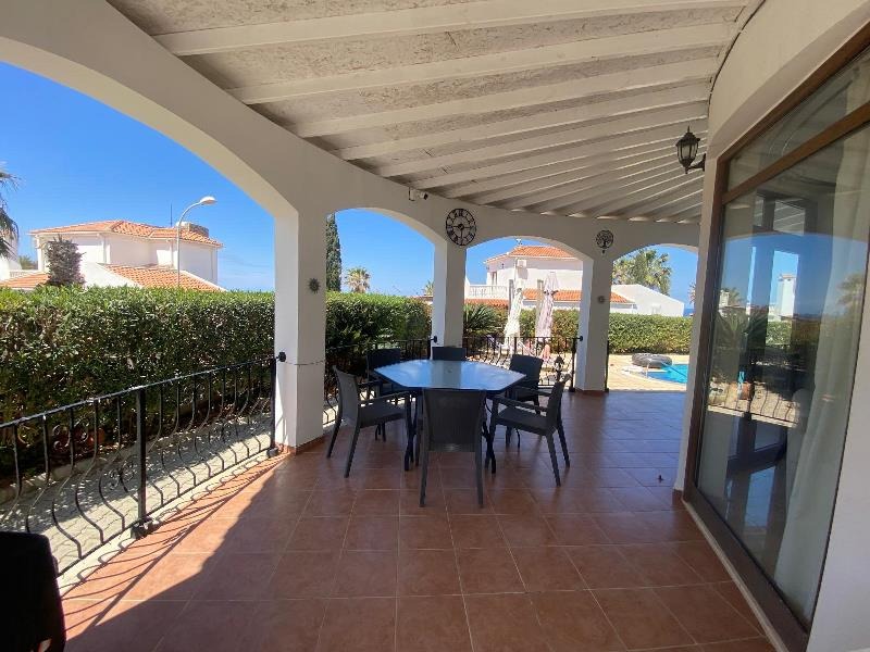 Located in the sought-after coastal region of Bahçeli, this beautifully maintained 3-bedroom, 2-bathroom detached villa sits just one row behind the seafront, offering an exceptional opportunity to own a home in one of the area’s most desirable locations. Upon entering, you are welcomed by a bright and airy foyer providing access to all ground floor rooms, including two spacious double bedrooms with built-in wardrobes, a family/guest bathroom, a fully equipped kitchen, and a separate living area. The generously sized lounge is enhanced by a charming fireplace, creating a warm and inviting atmosphere, while French doors lead onto an expansive covered terrace overlooking the private pool and garden—perfect for seamless indoor-outdoor living. One of the ground floor bedrooms also benefits from access to a quaint stone terrace with views over the private driveway. The master suite is elegantly positioned on the first floor for complete privacy, featuring a private en suite and direct access to an exceptionally large terrace boasting stunning sea views. Whether you are looking for a permanent residence, a tranquil holiday home, or a strong investment opportunity, this property truly offers the best of coastal living.