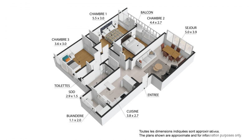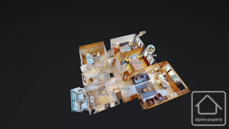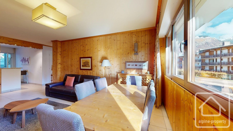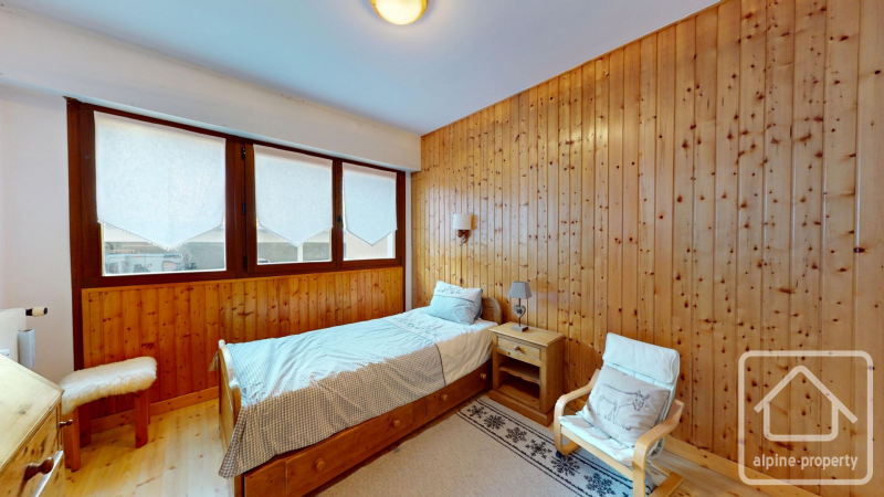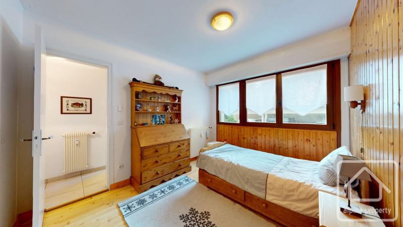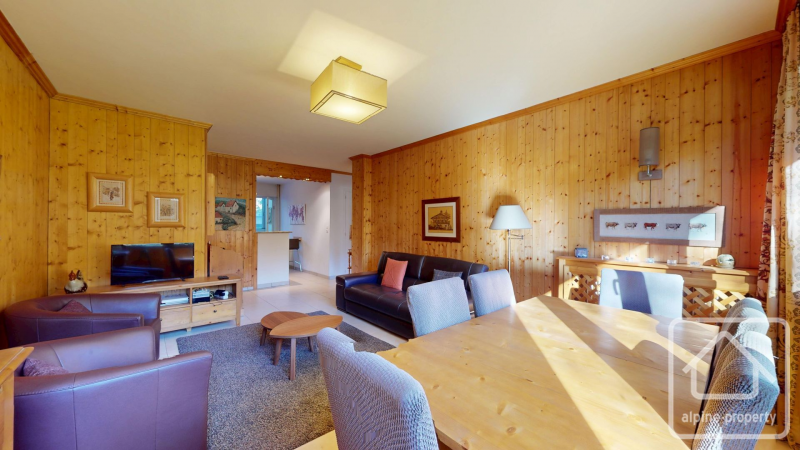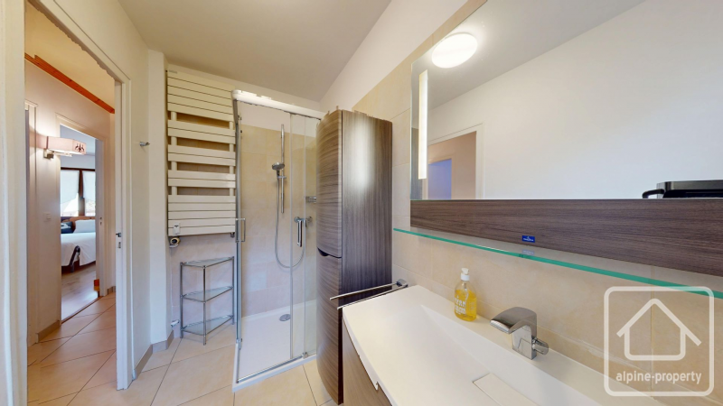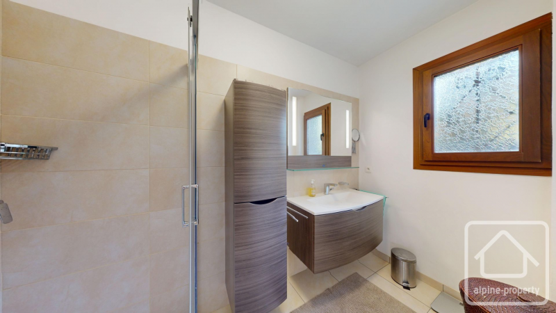 The spacious sitting room has super views over the mountainsides and plenty of natural light from the picture windows and, with the open fully-equipped kitchen, offers an easy flow for relaxing or entertaining. There is also a handy loggia off the kitchen which serves as a separate buanderie and storage area.