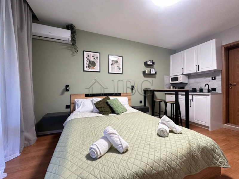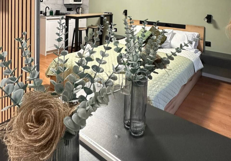 This cozy studio apartment offers 34 sq.m. of fully renovated living space. Every detail has been thoughtfully designed: the interior is decorated in pleasant green tones, with smart zoning — the kitchen area is visually separated from the sleeping area by a breakfast bar. The apartment features quality furniture and a fully equipped bathroom. A private, cozy terrace, hidden by lush greenery, is perfect for morning coffee or enjoying the fresh air.