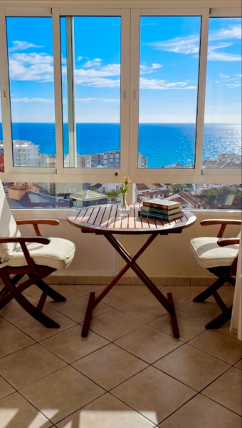 El espacio está muy bien aprovechado, con una zona de salón-dormitorio luminosa que conecta visualmente con el mar. Dispone de cocina equipada, baño completo y aire acondicionado. Su ubicación es inmejorable: a un paso de la playa, del Parque de la Paloma y rodeado de todos los servicios necesarios (supermercados, farmacias, restaurantes y transporte público).
