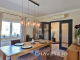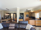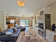 Large double-glazed windows and sliding doors open onto a covered terrace overlooking the south-facing garden and swimming pool, allowing seamless indoor-outdoor living.
