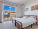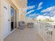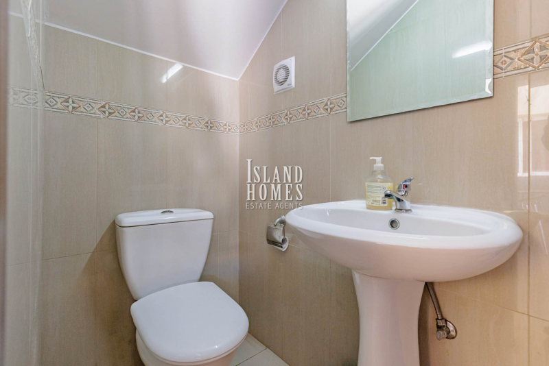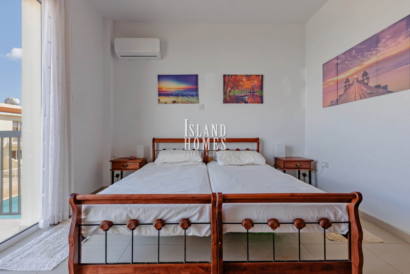The first floor has two bedrooms, both double in size. Each room includes floor to ceiling fitted wardrobes and air conditioning. The master bedroom includes an ensuite shower room with WC and sink with vanity unit. The second bedroom includes a veranda that boasts swimming pool and sea views. The main bathroom is bright with natural light and boasts a bathtub, WC and sink with large vanity unit, ideal for storing towels and toiletries.