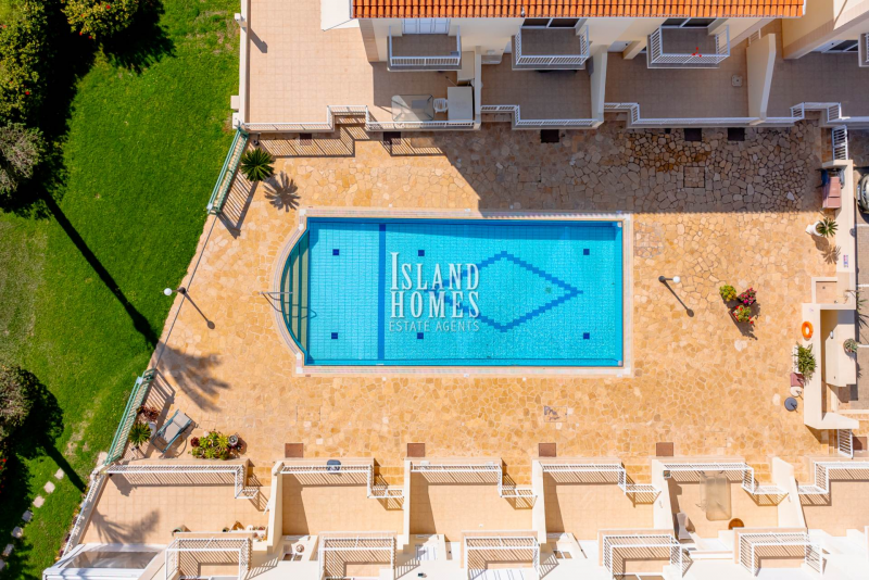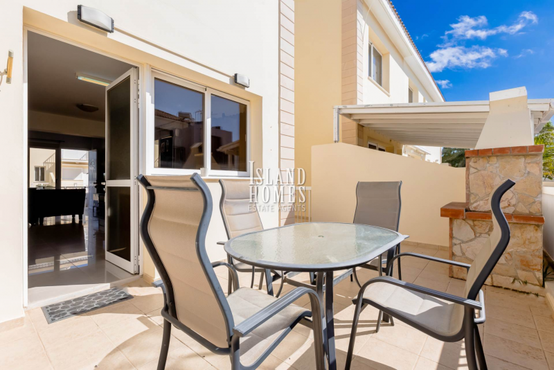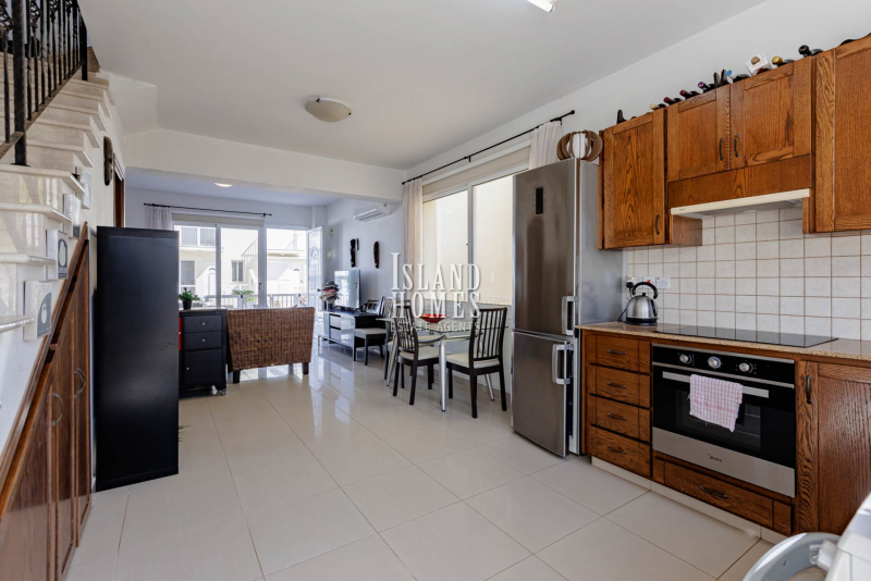 This delightful town house is located in an enviable position just a few hundred metres walk to the beaches of Kapparis. Accessed via a gated entrance from the communal pool terrace, the front veranda provides a welcoming approach to the property, with the main entrance door opening into a well designed open-plan living, kitchen, and dining area. The living space is enhanced by patio doors that lead directly back out to the veranda, offering pleasant views over the communal swimming pool and creating a seamless connection between indoor and outdoor living. A convenient guest WC is also located on the ground floor. The kitchen is the ideal space to rustle up a picnic for a day at the beach or preparing BBQ accompaniments to dine al fresco. With plenty of natural light the kitchen has direct access to the rear terrace. A delightful space ideal for enjoying a good book and a cold drink during the warm summer evenings, while lighting the brick built BBQ. Owing to the property being semi detached there is also a walkway along one side of the house allowing external access from the front to the rear veranda.