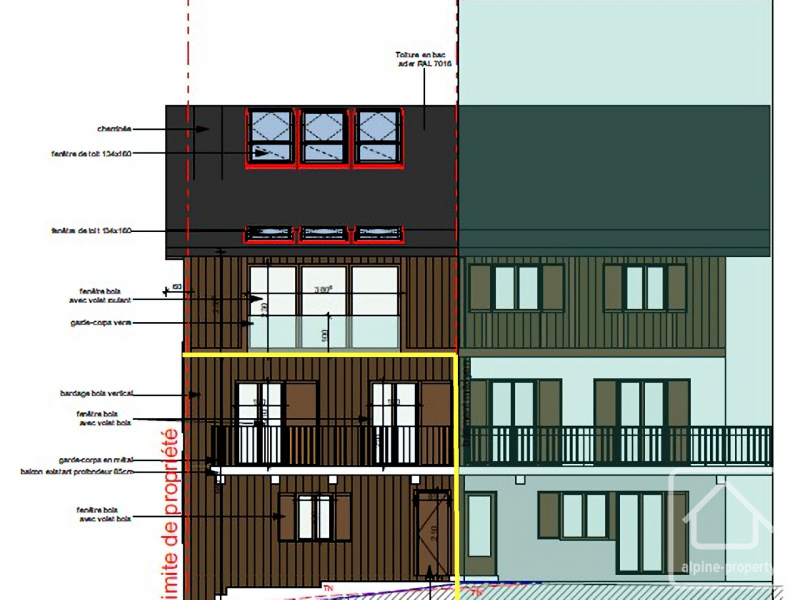 - **First floor (developer suggestion):** Open-plan living/kitchen with west-facing balcony + 2 en-suite bedrooms - triple exposure with stunning views of Mont Blanc, Les Drus & Le Brévent