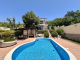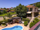 The landscaped yard is beautifully maintained, with decorative plants, green lawns, and a private swimming pool. The property is fully fenced and provides privacy and comfort.