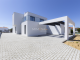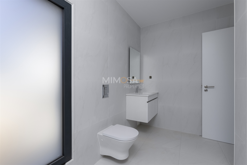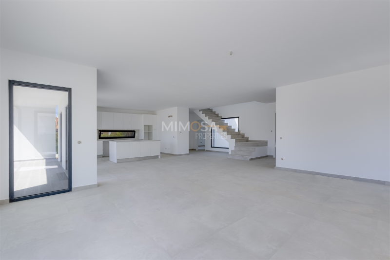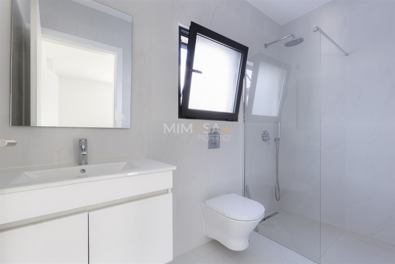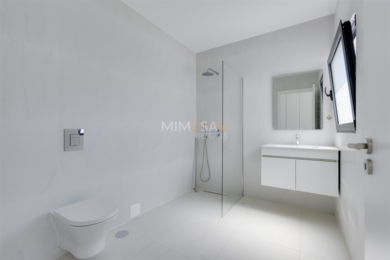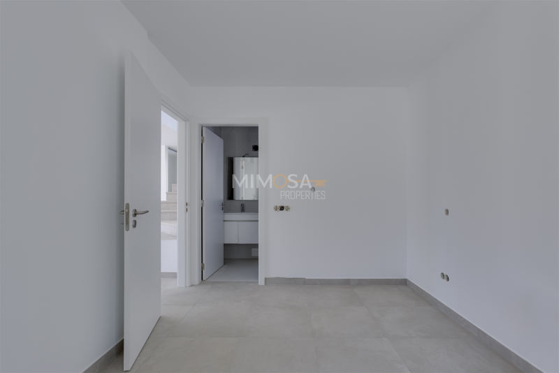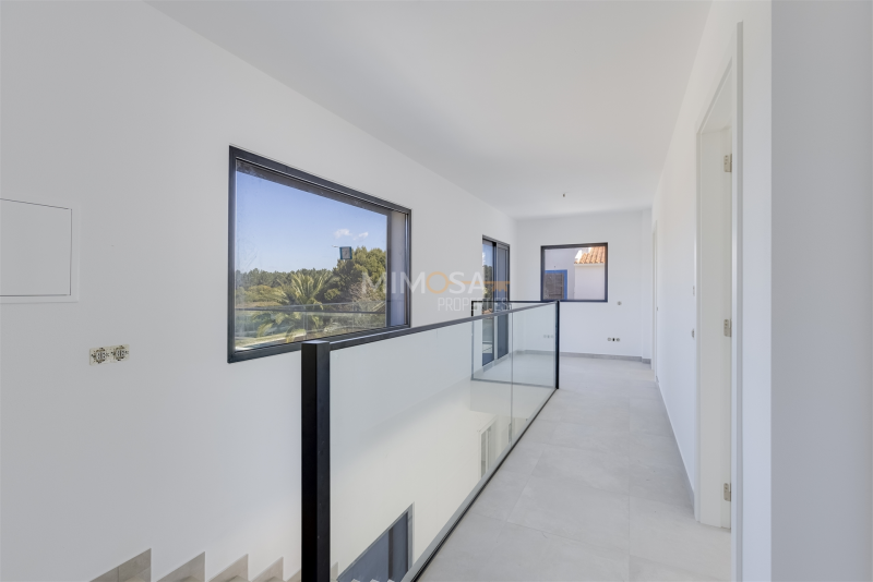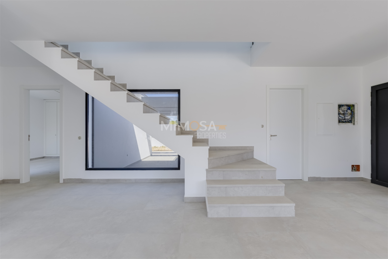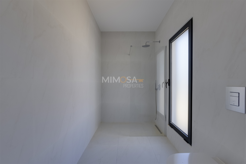 The brand-new modern villa is divided over two floors. Entrance, hallway, spacious open plan kitchen, fully luxury equipped, living room with access via the sliding doors towards the terraces and the pool. Two bedrooms are also situated on the ground floor with two en suite bathrooms. On the upper floor, two bedrooms en suite with access to the balconies. The house has got high standards for modern living, besides, complete isolation, double glazing, and underfloor heating, it also has electric shutters, air conditioning in every room, and a solar panel system.