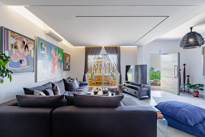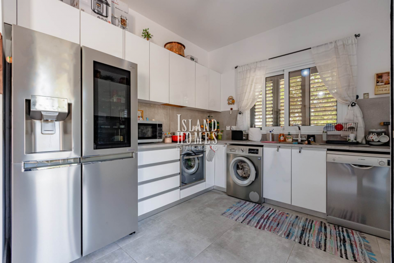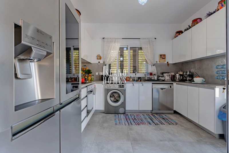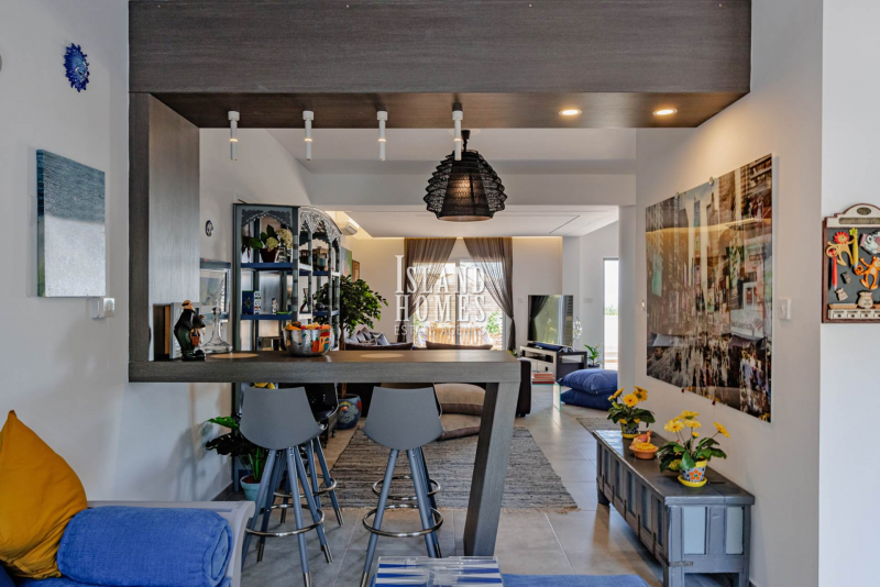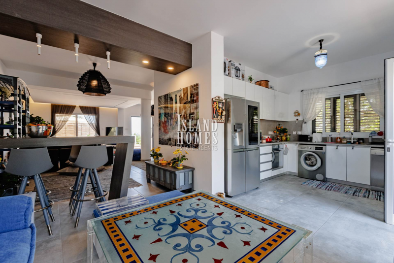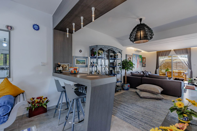 This is a fabulous opportunity to own a superbly presented property in a sought after area overlooking Ayia Napa. Situated on a small complex of 8 other similar properties, the gated driveway leads to a wraparound plot which offers a fabulous raised front veranda. The entrance door opens into a beautifully presented and welcoming open plan ground floor.Every detail in the house and grounds has been carefully thought out by the current owners. With a spacious feel and a stylish partition breakfast bar the living space is a cosy and inviting area. From the breakfast bar there is a snug area adjacent to the kitchen. The spacious kitchen is well laid out and equipped with brand new, high end appliances and offers plenty of natural light from two sets of windows. The kitchen includes direct access to the garden and the snug area also includes patio door access with a pool view. The ground floor includes a handy guest WC.