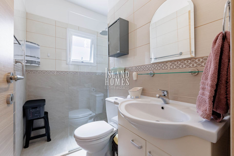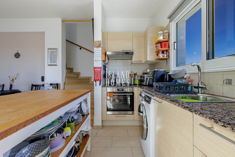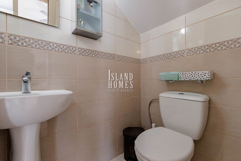 This semi detached property sits on a well maintained development on the outskirts of Frenaros village. With a gated driveway offering off street covered parking the property includes a raised side veranda and a seating area at the rear. The front door enters into the open plan living, dining and kitchen area with a handy guest WC at ground floor level. The living area boasts a cosy log burner for the short winter months. The kitchen includes an island which doubles as a handy breakfast bar and offers plenty of natural light from the window over the sink which offers views over local fields as well as the patio doors which offer access to the raised veranda at the side of the house.