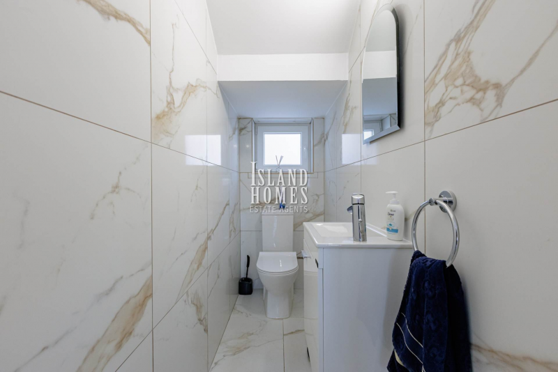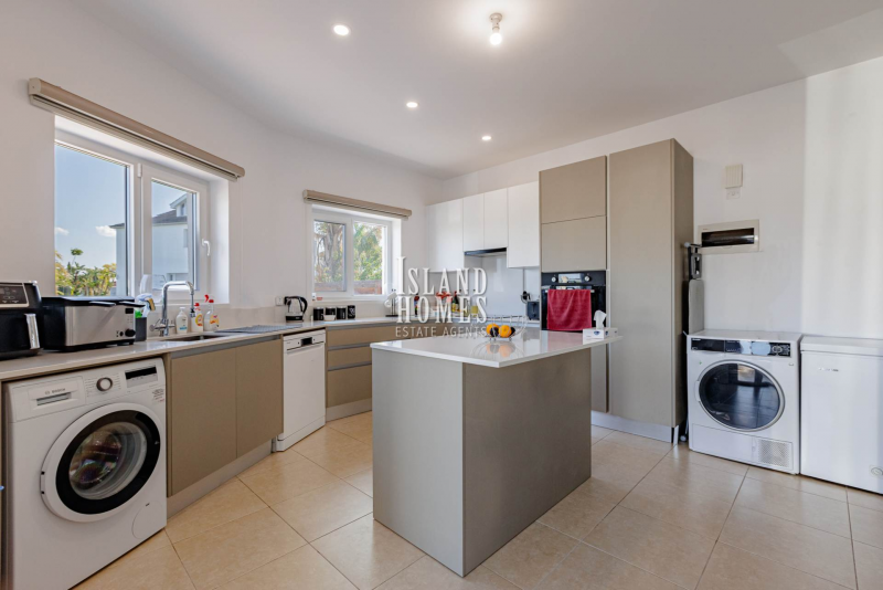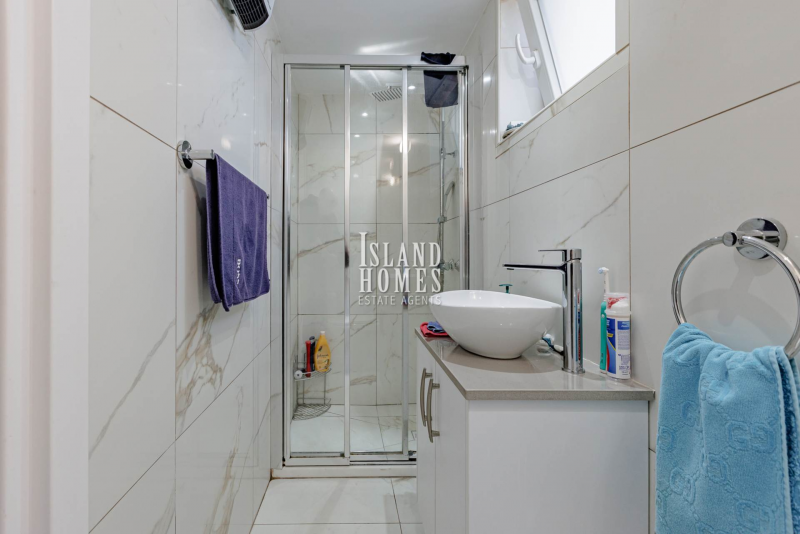 Internally, the ground floor offers a well-designed open-plan layout. The living area is slightly offset, creating a cosy yet connected space, while the bright and modern kitchen diner has been renovated to a high standard. The kitchen is both stylish and practical, featuring quality finishes and a central island that enhances functionality and social living. A stylish guest WC completes the ground floor. Upstairs, the villa comprises three generously sized double bedrooms, all with built-in wardrobes. The master bedroom enjoys the added luxury of a private ensuite shower room with a walk-in shower, as well as access to a private veranda with glass railings an ideal spot to relax and take in the surrounding countryside views. The remaining two bedrooms share the family bathroom, which has been beautifully upgraded with contemporary grey marble-effect tiles and a modern walk-in shower.